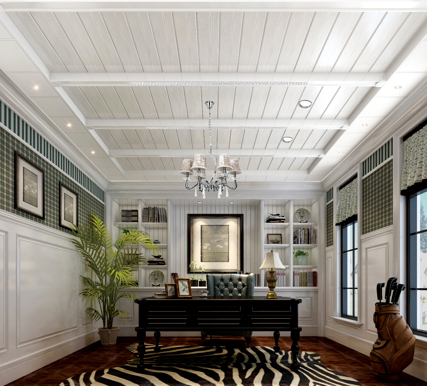 簡約美式風(fēng)格的書房,簡潔明了,室內(nèi)采用一色的灰白樣式,吊頂采用橫木樣式的,邊上裝上幾個(gè)小筒燈,使之書房增加明亮度。采用抽象繪畫和雕塑來裝飾,打破一些乏味、單調(diào)、生硬的線條,以期獲得完美豐富的空間感受。在這樣的書房,你的思緒是不是也會(huì)多一點(diǎn)呢?